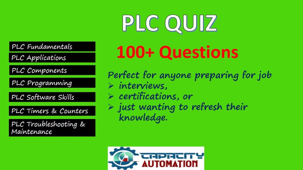 This interactive quiz course is designed for students, technicians, and engineers looking to test their understanding of Programmable Logic Controllers (PLCs). It covers foundational concepts like ladder logic, input/output modules, timers, counters, memory addressing, and basic troubleshooting. Perfect for anyone preparing for job interviews, certifications, or just wanting to refresh their knowledge.